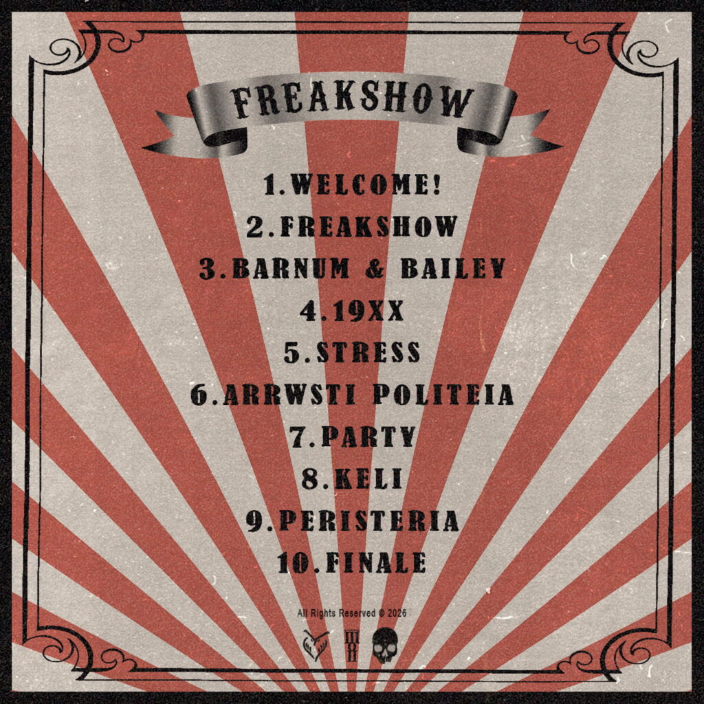 Στο πλευρό τους, ο Spiderkilli έδωσε το δικό του ιδιαίτερο χρώμα με τα keys του στα tracks “STRESS” και “PERISTERIA“, ενώ o DJ Handyscratch απογείωσε την ενέργεια με τα τρομερά cuts του στο ομώνυμο “FREAKSHOW” και στο “19XX“, προσθέτοντας μια ξεχωριστή δυναμική στο συνολικό αποτέλεσμα. Μέσα από τις ρίμες τους, οι καλλιτέχνες δημιουργούν ένα ιδιαίτερο σύμπαν που δίνει στον ακροατή την αίσθηση ότι παρακολουθεί ένα «rap freakshow» γεμάτο δύναμη, αδυναμίες, συναίσθημα και προσωπικότητα.