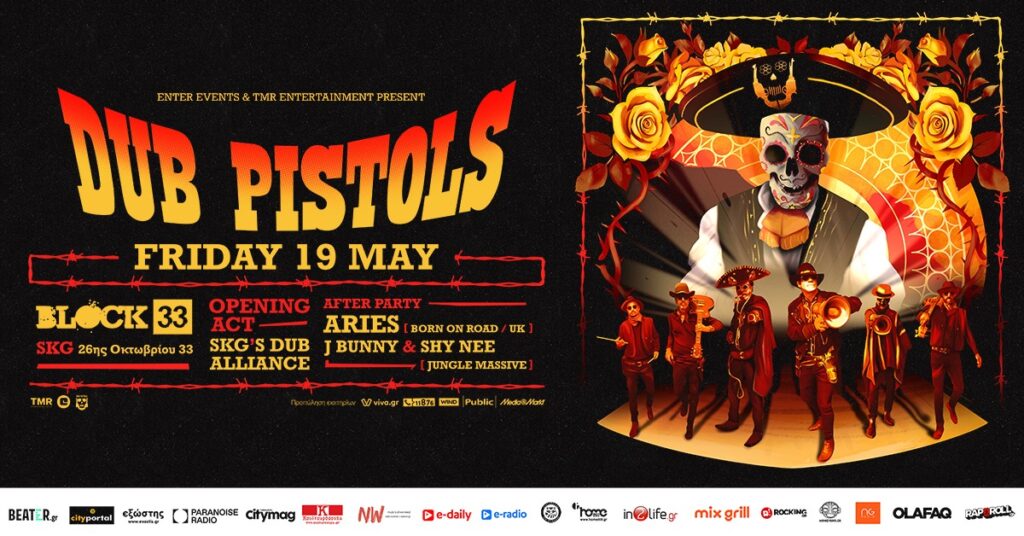 Οι Dub Pistols, ένα από τα πιο γνωστά punk & ska acts του πλανήτη, θα βρεθούν την Παρασκευή 19 Μαΐου στο Block33 για να προσφέρουν ένα εκρηκτικό και καθηλωτικό live. Οι αξεπέραστοι αυτοί dub πιστολάδες έρχονται μετά από 4 χρόνια για ένα ταραχώδες, γεμάτο σαματά party, που αναπόφευκτα θα μας απογειώσει! Ετοιμαστείτε για ένα αχαλίνωτο μείγμα από reggae, ska, punk, hip-hop, breaks, beats και drum ‘n’ bass, ένα υπερθέαμα γεμάτο dub σεισμικές δονήσεις εκρηκτικά χάλκινα, επικά ντραμς και μπάσα.