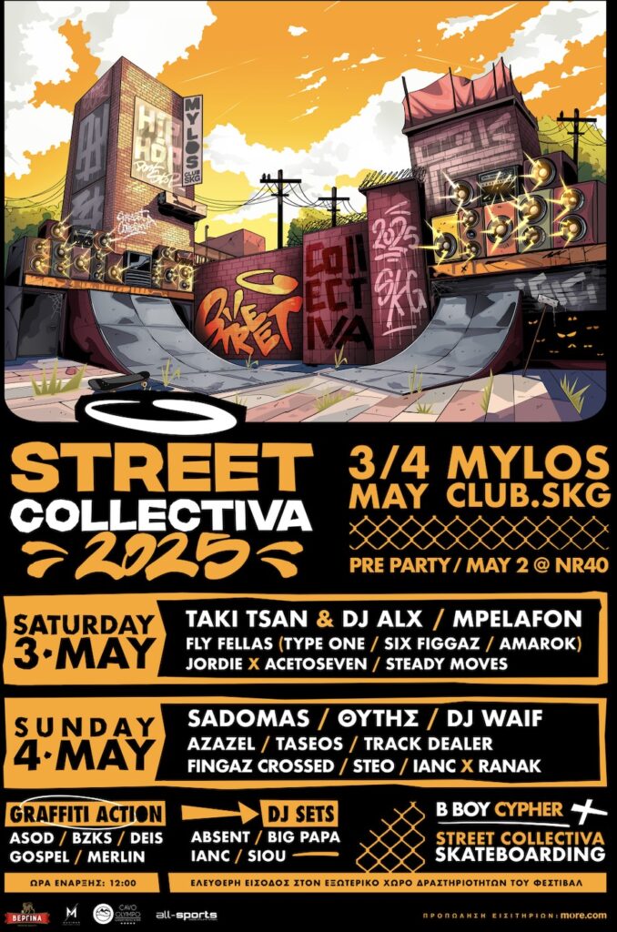Το Street Collectiva επιστρέφει για δεύτερη συνεχόμενη χρονιά, φέρνοντας ξανά στη Θεσσαλονίκη τη δυναμική του ελληνικού hip hop. Ένα διήμερο γεμάτο live performances, DJ sets, street culture και αυθεντική ενέργεια στον συναυλιακό χώρο του Μύλου.