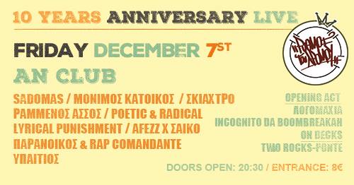 10 Χρόνια Ρυθμοί του δρόμου Live @ An Club 10 χρόνια ζωής με ένα επετειακό live σε έναν ιστορικό χώρο το AN club ‘official’!! Live επί...