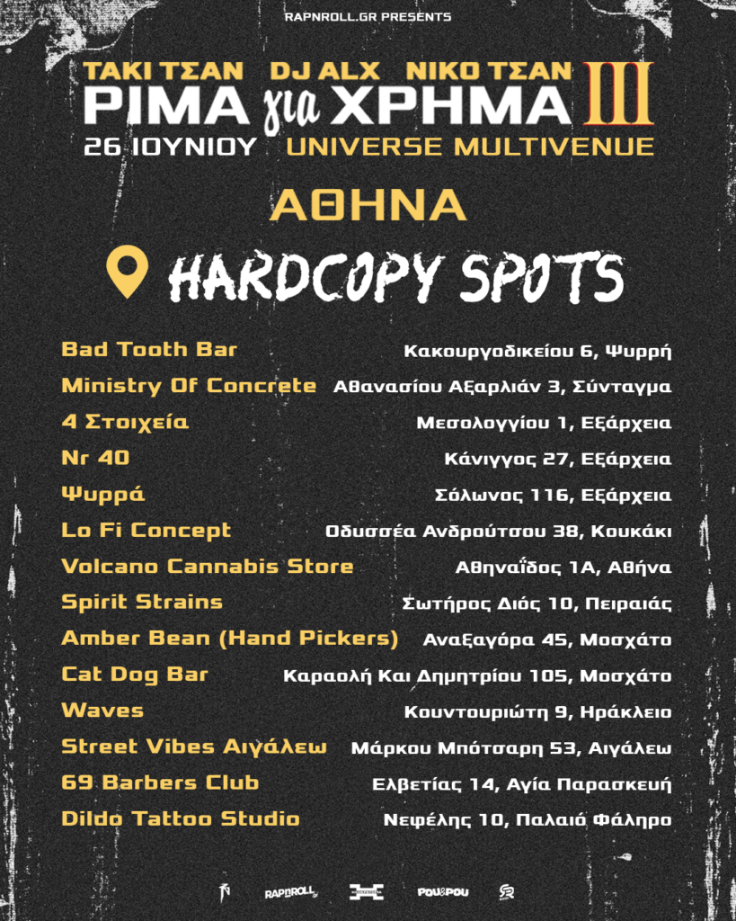 Ο ΤΑΚΙ ΤΣΑΝ και ο DJ ALX, μαζί με τον ΝΙΚΟ ΤΣΑΝ, έχοντας διανύσει σχεδόν όλη την Ελλάδα με την περιοδεία ΡΙΜΑ για ΧΡΗΜΑ ΙΙΙ TOUR, κάνουν μια μεγάλη στάση στην ΑΘΗΝΑ για την παρουσίαση του νέου τους δίσκου ΡΙΜΑ για ΧΡΗΜΑ ΙΙΙ.